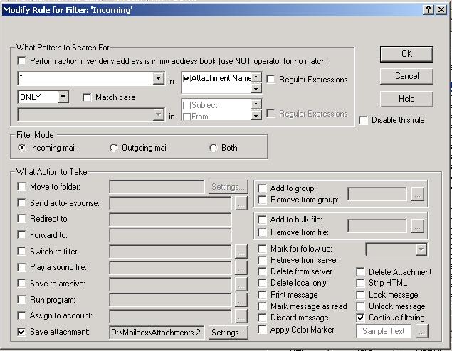 Notes: You can set up more than one filter if you want to save different attachment types, or attachments from different people, into different directories on your hard drive. In this case you wouldn't use the * wildcard for the pattern, but instead use an attachment type (such as *.doc) or a person's name or email address as the patterns.