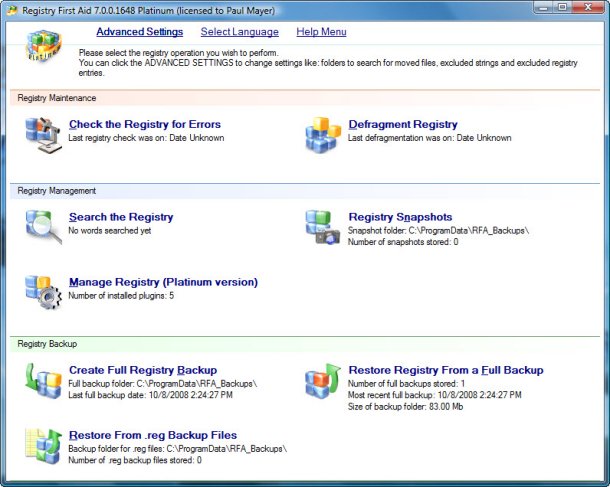 Below is a view of Registry First Aid opening page with multiple choices to tune up and make your registry run like a fine clock.