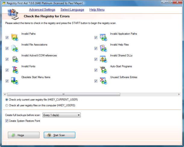 Below is a view of Registry First Aid Registry Options page. Note that you can select all types for checking.