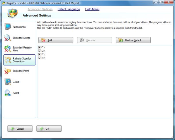 Below is a view of Registry First Aid displaying the main configuration page, selections on the left offer many other options.
