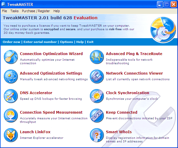 TweakMASTER 2.0 includes several major upgrades over version 1.x. Besides improved Internet Optimization functions, DNS Accelerator, Clock Synch and Keep Connected utilities. TweakMASTER Pro 2.0 also include sthe following: